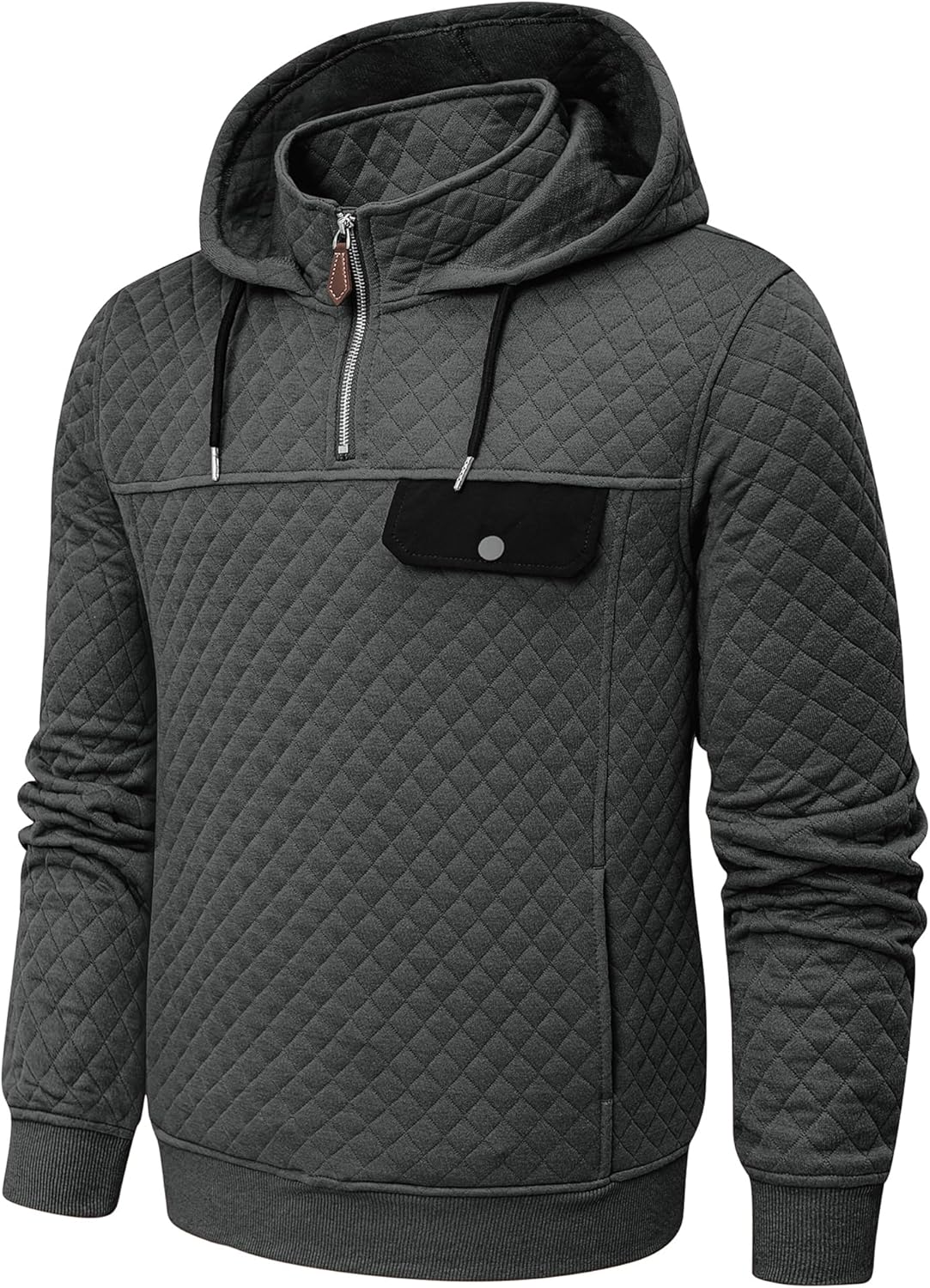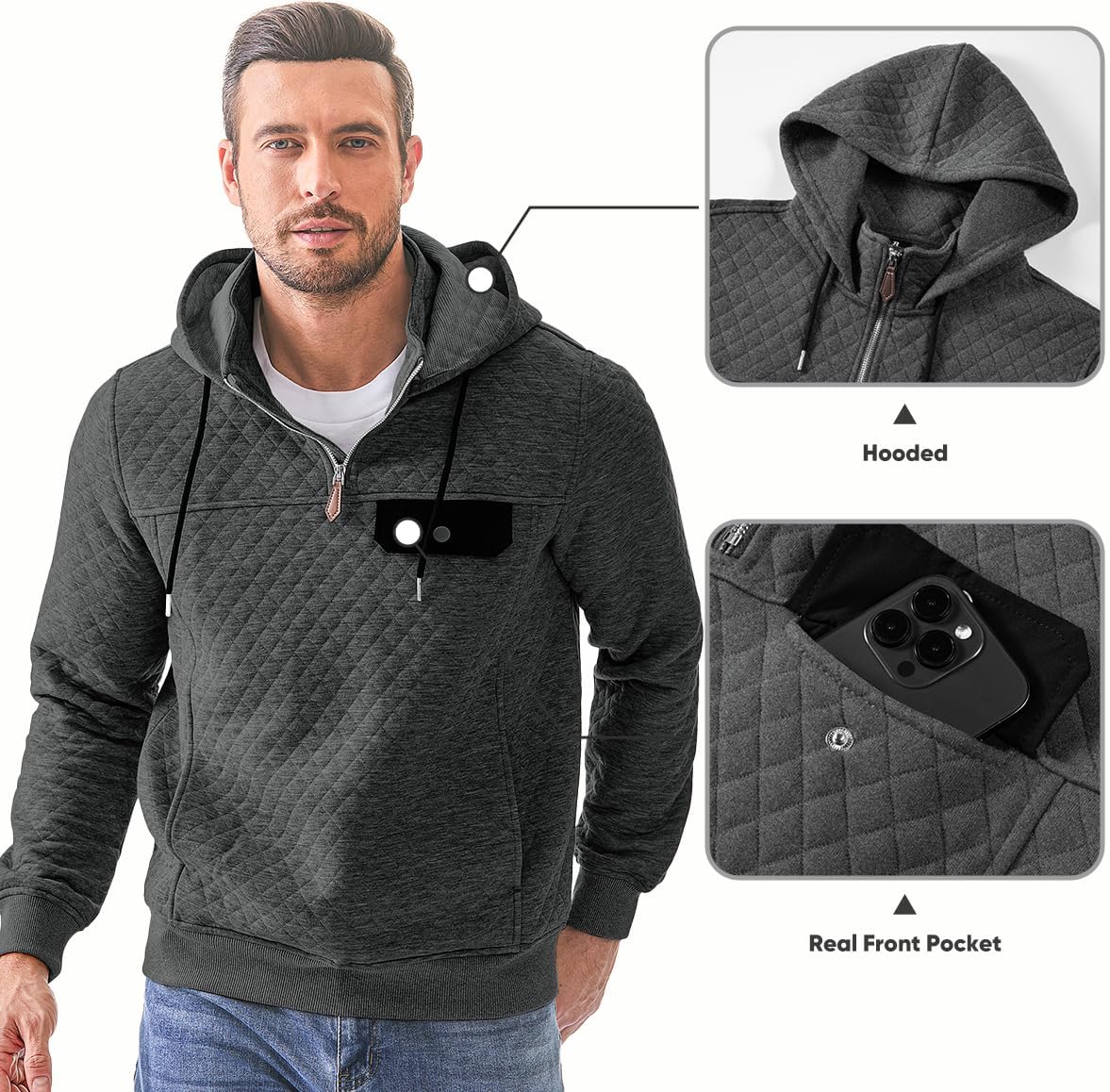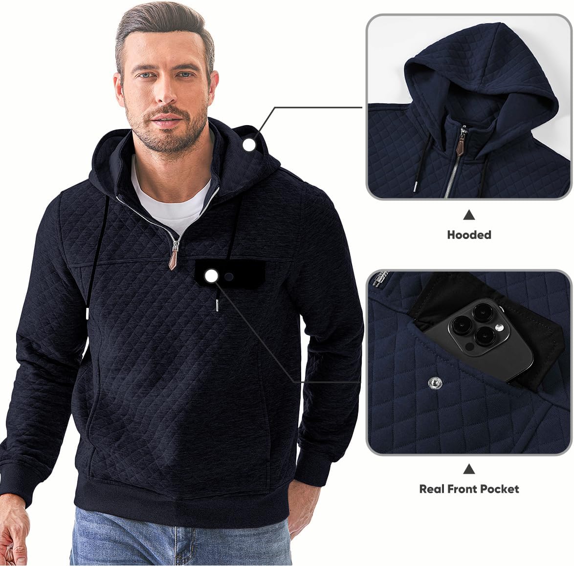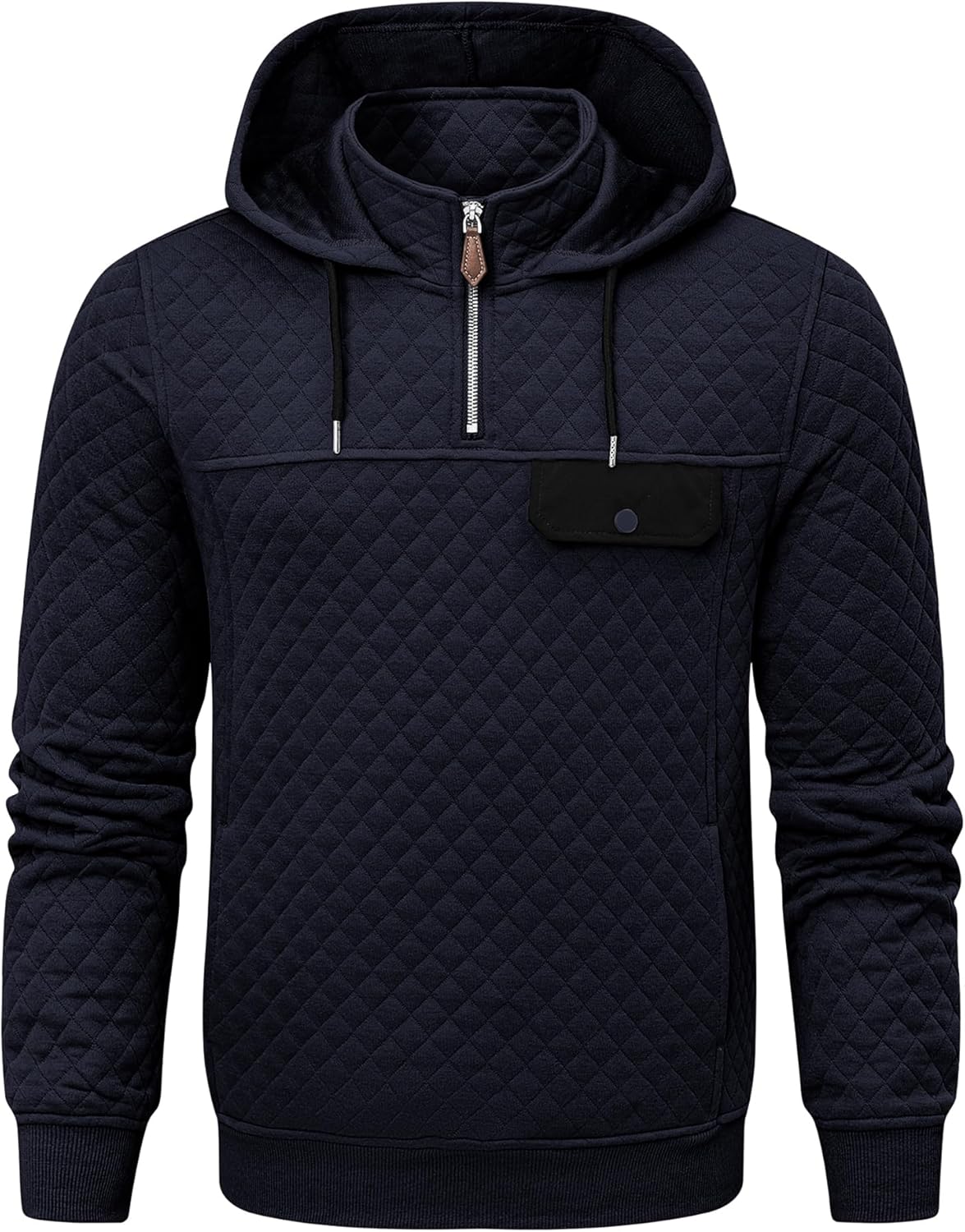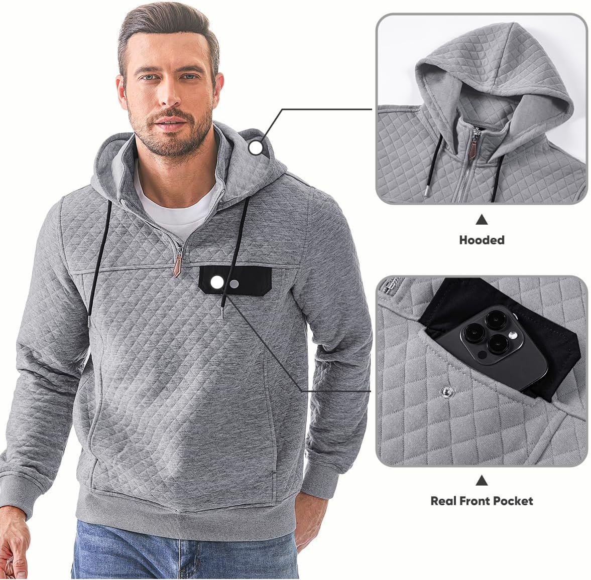 Men's Quilted Hoodies Casual Long Sleeve Quarter-Zip Pullover Sweatshirt with Pockets