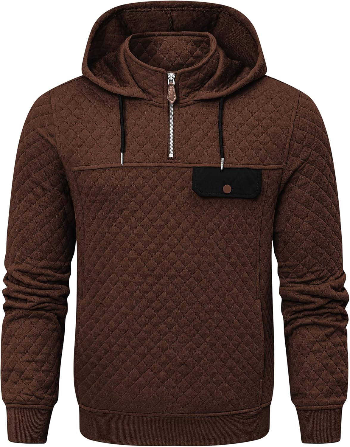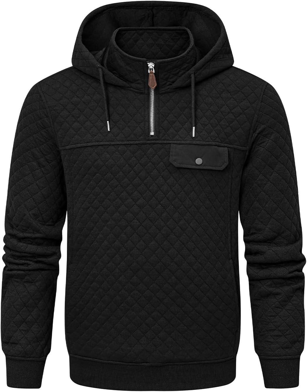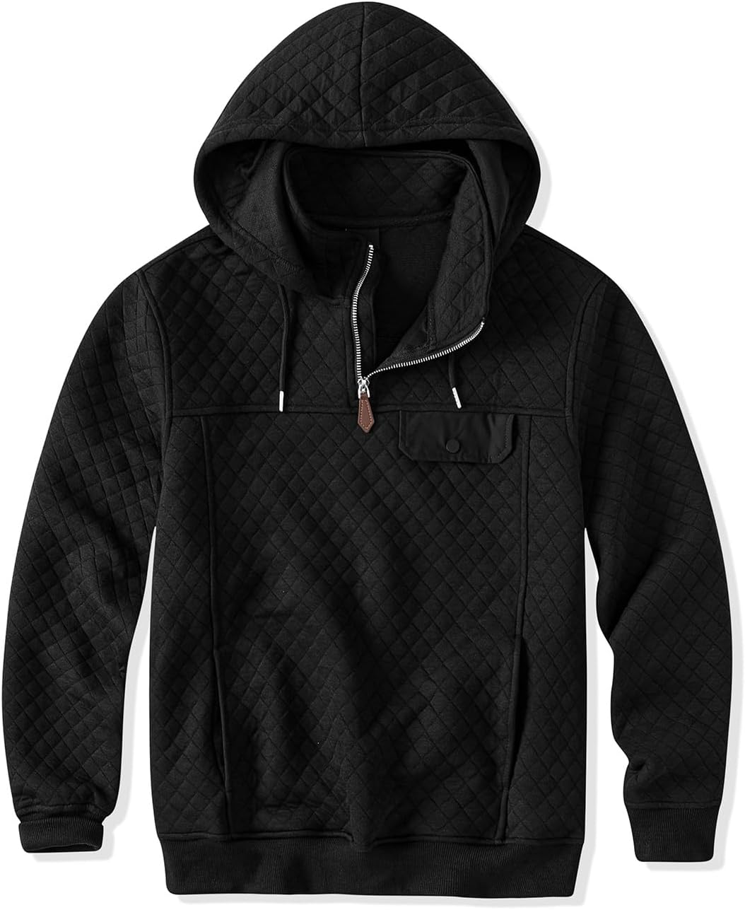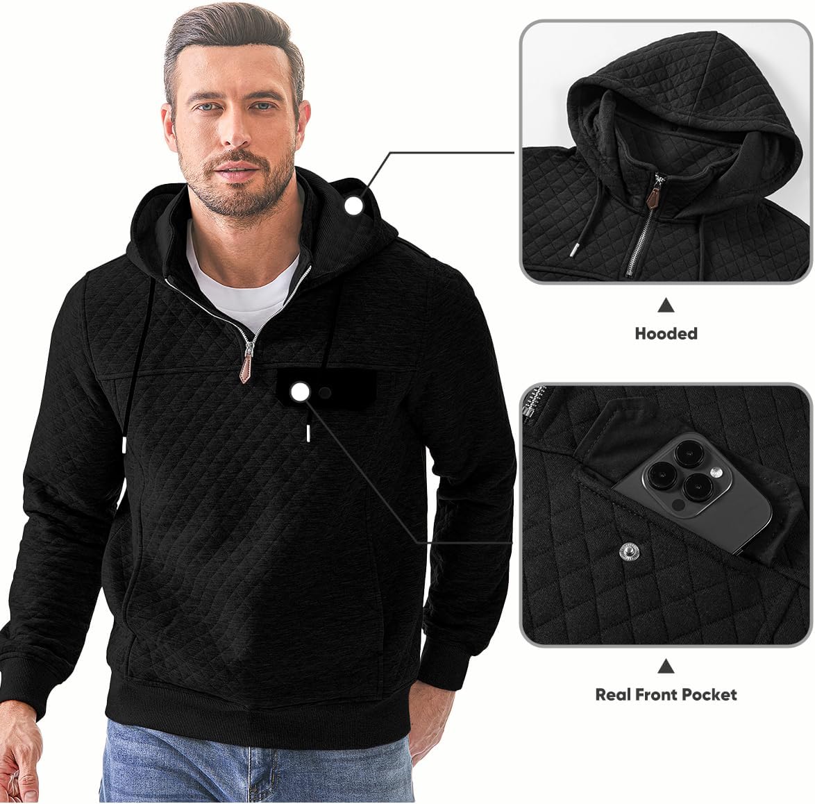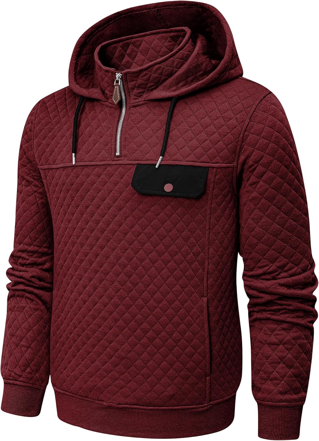 Men's Quilted Hoodies Casual Long Sleeve Quarter-Zip Pullover Sweatshirt with Pockets
