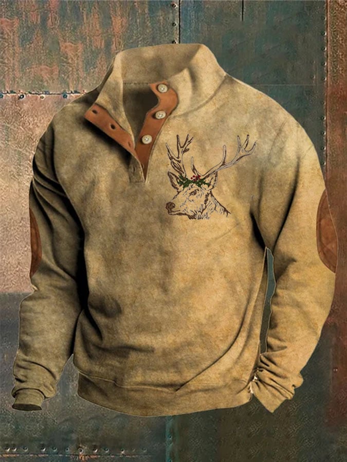 Herren-Sweatshirt mit Vintage-Hirsch-Ethno-Muster und Reißverschluss